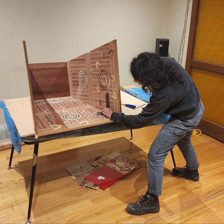 Made for the exhibition Overlay: A New Australian Heritage; a re-imagining of inherited heritage guidelines and aesthetics to more authentically reflect our current climate and context. “A Heritage Reclaimed” invites the audience to search beyond the façade of heritage buildings and bring forward the history heritage guidelines failed to acknowledge. Inside the cabinet, a triptych constructed from reclaimed native Australian timber and veneer reveals a snapshot of harmonious living prior colonisation, the displacement and genocide of First Nations people during colonisation, and a future where First Nations people displaced from culture and Country can return home, practice culture, learn language and find their family. Lined behind the doors, illustrations inspired from Australia's colonial past magnify the genocide, suppression and control endured by the First Nations People. To reveal the intricate contents of the plain exterior, the user must engage with the piece and “open its doors”, a symbol of self-initiated pro-action that works towards the reconciliation between Australia’s past, present and future.